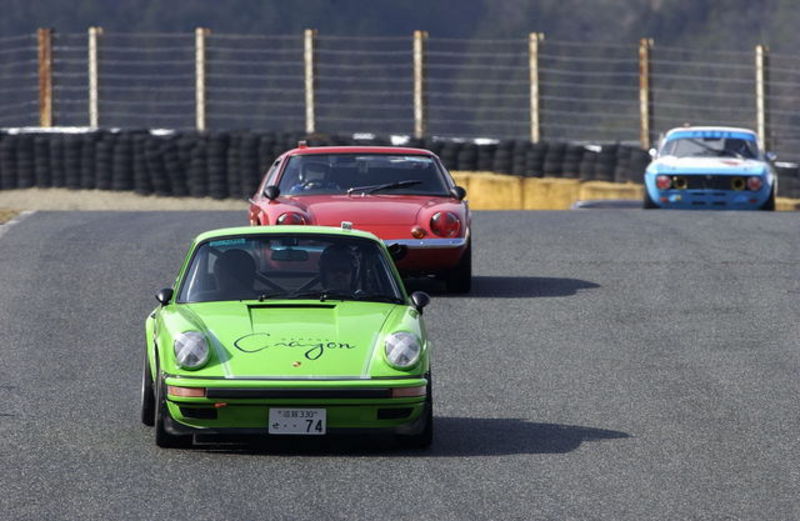 今年も 私は晴れ男です (笑) 当然天候は 晴れ 路面はドライ 空気も意外と乾燥して気持ちの良い天気です (寒くも無く暑くもの無く)最高.................... 今年49歳私の初トライ Jクラッシク 911DAYSポルシェレースの欲張りダブルエントリーいたしました Jクラッシクのレース運び結果 参加台数23台 予選は 一つ前のミニレースで コースのコーナー約三分の一の所に オイルが落ちており そこに石灰がまかれたコース状態での予選でした いざコースを走ると コースライン上に石灰の白い粉が.前を行く車が まきあげ 前の見えない状態です そんな中で全車が普段のタイムをたたき出せず 予選が終わりました(普段のタイムの3秒遅れ) 私は 予選二番狙い(イン側)予定が最近私と激しいバトルを繰り広げる オレンジのX1-9(離婚暦9回とゆういみではありません) フィアットのミドシップスポーツカーでとても綺麗で速いいくるまです トヨタのMR2の原型とも思われる名車です 決勝まさかの.ポールとなった私(コース上の石灰のおかげで) スタートととりあえずモーダッシュで一コーナーをインにつき ファーストラップをかなり遅い目でクリアーそして タイヤの温度がベストの状態になる3周目あたりから 後ろX1ー9とサニーワークスの激しい二番手争いを ミラーで見ながら 周回を重ねましたが 二番手争いを制したX1-9が 私に激しく接近 去年の最終戦のように襲い掛かってきました 激しいバトルの最終ラップポルシェの1番苦手な下りの左の逆バンクで(最終コーナー3つ手前)インを刺されトップを明け渡し最終コーナーを二番手で追い上げる これ実は想定内です 最終コーナーで周回遅れの車が...........クリアーこれ想定外そして最終コーナーをイン側で立上がりる私74カレラそしてアウト側を綺麗に立ち上がる X1-9二速勝負で私が追いつき 3速で追い抜き.トップでチェッカーを受けることができました 私を応援で見てくれる人には はらはらどきどきの見ごたえのあるレースでした RRのポルシェの立上がりに感謝のレースでした (二回目のポールトゥーウィン) ポルシェレースに続く...........