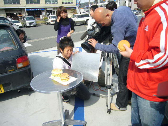写真は ビックマックとの比較 そして私のバイクとの映像(このシーンテレビに写るかも そしてハンバーガーを作っているところです