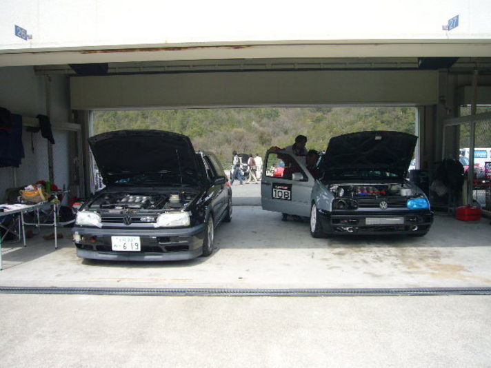 前日 手首の骨折をし 急遽監督になりレースを戦いました しかし左ハンドルの黒GTIの番頭伊藤 井上チームのセッティングと 15分だけ 走りました (片手で嫁にあほと言われました(笑い) 結果目標の周回数に少し届きませんでしたが シルバーのオリエンテッド カスターマーで製作した ゴルフはエンジンノーマルで35秒台の目標タイムと クラス2位の好成績で今回のレースを終えました クラス1位との差は10秒以内のきん差でした 写真は 完走した車に贈られる フライングトンネルです |